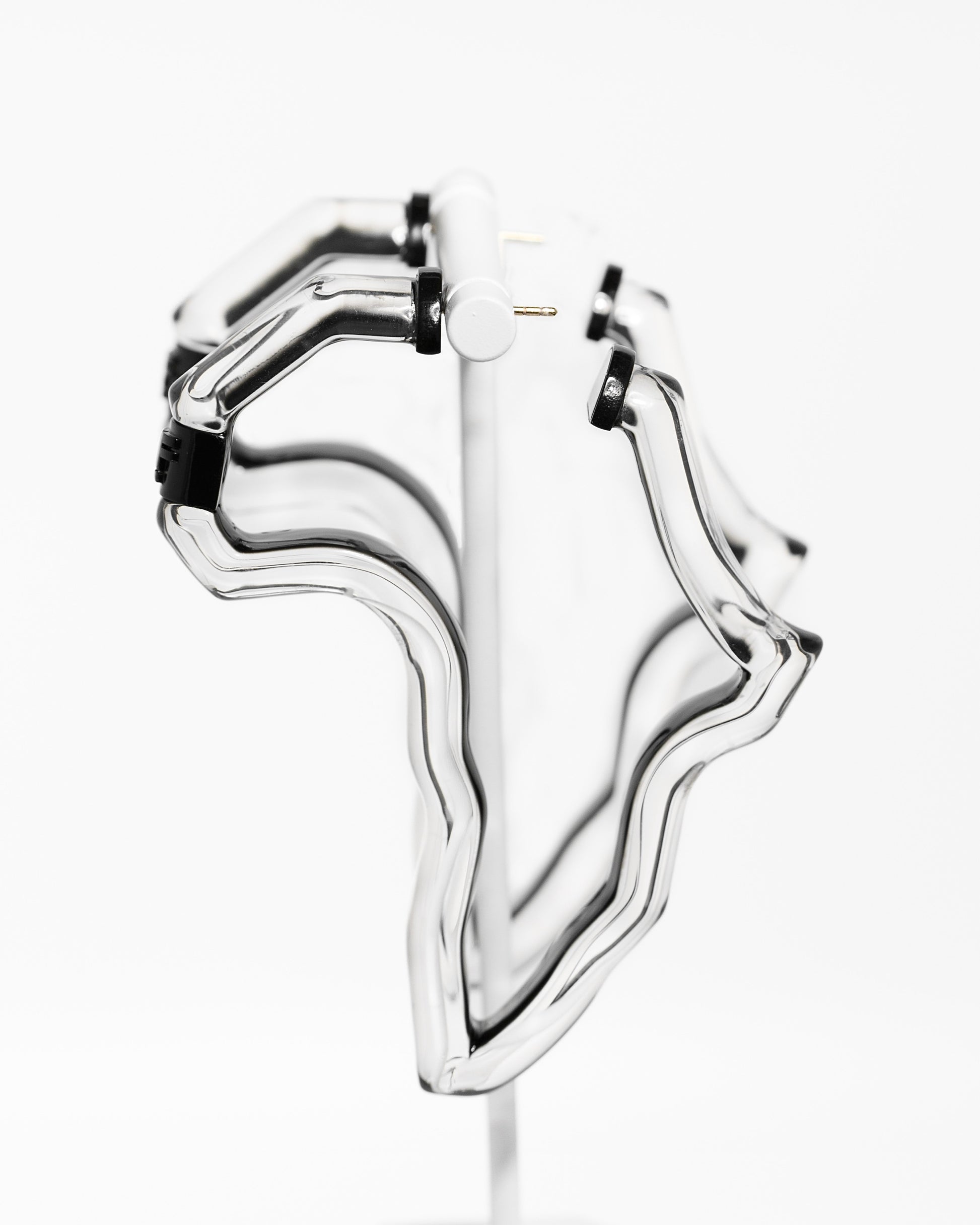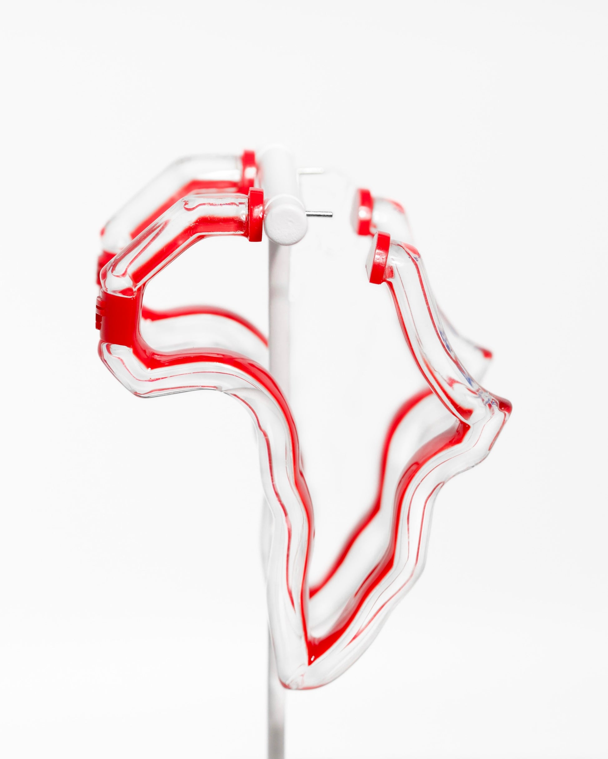 Designed to be Boldly shaped as the African continent and hand-painted by skilled artisans on the back of crystal-clear Lucite, these statement hoops deliver vibrant color from the front and a sleek, transparent view from the side. These hoops shift in color and light with every turn of your head, creating a dynamic peekaboo effect that catches the eye.
